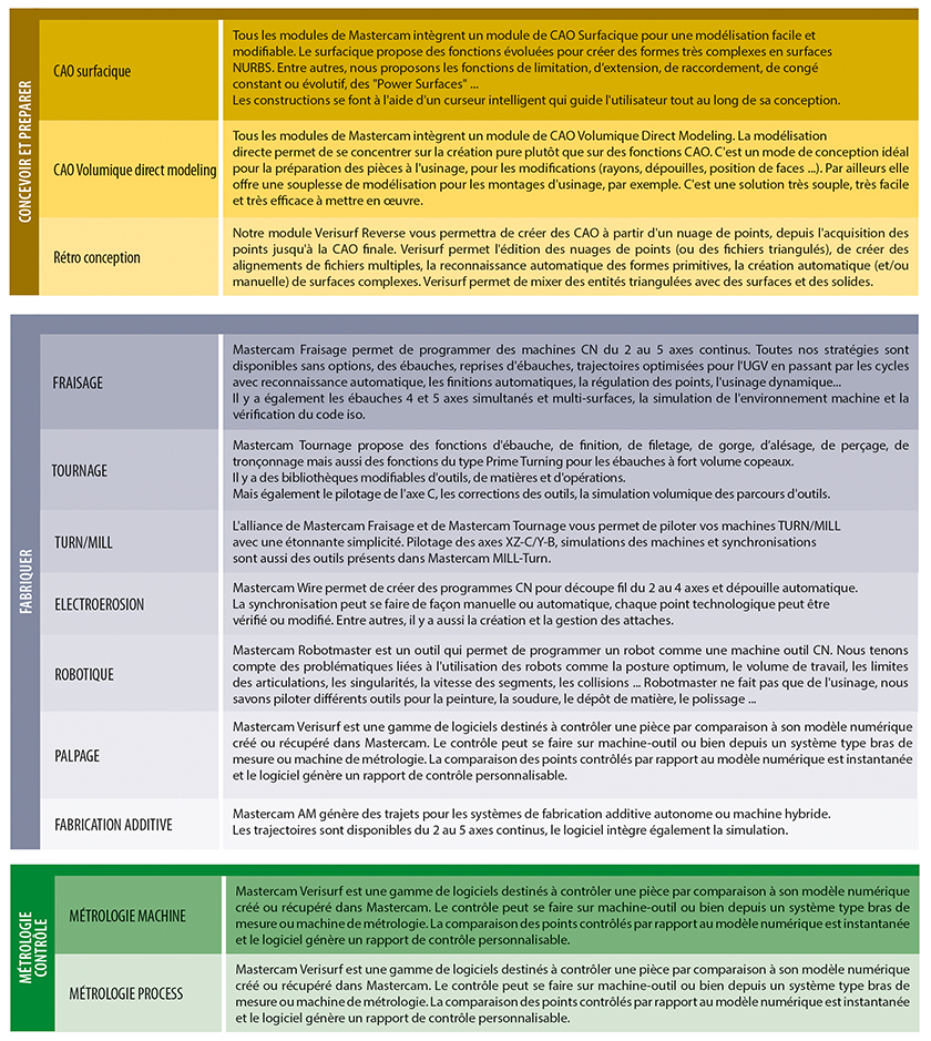 En France, plus de 2600 sociétés programment leurs MOCN avec MASTERCAM. Chaque distributeur est un véritable centre de compétence en productique, capable de fournir MASTERCAM la formation, les post-processeurs ainsi que des prestations complémentaires comme des liaisons machines-outils ou du développement spécifique.