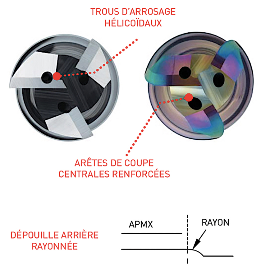 Ces deux nouveaux types d’Alimaster présentent une hélice variable et des goujures polies. La géométrie des goujures évite le broutage. Les goujures hautement polies facilitent l’évacuation des copeaux durant les applications hautes performances. En outre, la coupe au centre a été optimisée afin d’offrir une résistance et une fiabilité accrues, même en plongée.