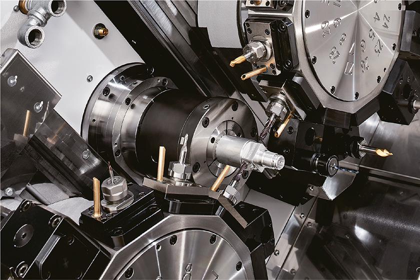 Le tour M5-32 VIII, disponible depuis mars 2020, s’adresse, plus largement, à tous les secteurs d’activité qui nécessitent des capacités importantes d’usinage et de fraisage. Grâce à sa tourelle magasin d’outils, à son peigne et à son bloc arrière de reprise, il est possible d’avoir deux outils dans la matière en broche principale ainsi qu’en contre-broche. La puissance et le couple sont augmentés en contre-broche et sur les outils motorisés de la tourelle. Le travail avec ou sans canon est possible et le passage en barre peut être porté de 32 à 38 mm.