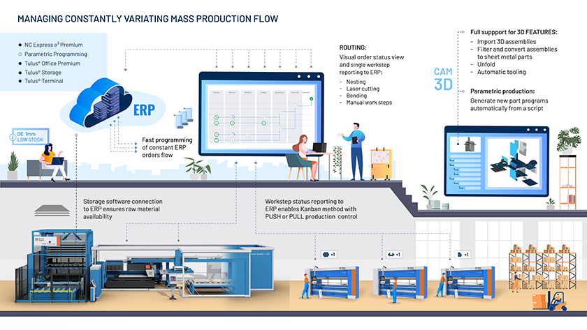 À Blechexpo, Prima Power présentera tous ses logiciels permettant de prendre en charge différents niveaux d’automatisation de la production. De l’automatisation unique du flux d’informations à l’opération entièrement automatisée sans surveillance, de la production statique à la production de masse variant constamment, toutes les exigences de fabrication possibles sont efficacement couvertes par le logiciel Prima Power.