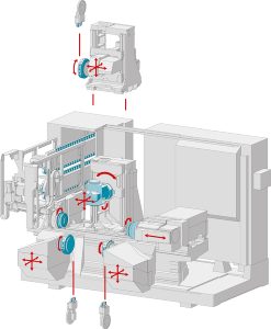 Détail important : grâce à la taille de la zone de travail et à la distance entre la broche principale et la contre-broche, l’usinage simultané est possible avec la moto-broche de fraisage et les tourelles d’outils sur la broche principale et la contre-broche, sans risque de collision. La capacité de plongée des tourelles d’outils permet également de prévenir les situations critiques de collision.