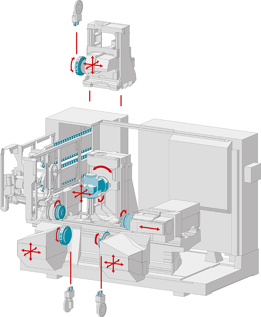 Un élément clé est le chariot de l’axe Z avec la moto-broche de fraisage et l’axe Y/B à suspension hydrodynamique, situé au-dessus de l’axe rotatif. Le puissant entraînement de la broche (40 kW, 207 Nm, 6 000 min-1 (40 % DC)) facilite une large gamme d’opérations de perçage et de fraisage et ce jusqu’à l’usinage sur cinq axes. Pendant l’usinage, la broche de fraisage prélève les outils dans un magasin pouvant accueillir jusqu’à 139 outils (HSK-T63 ou HSK-T40). Il se distingue par sa grande convivialité en matière d’équipement. Car, à côté de l’habituel poste de préparation situé à l’avant, on trouve sur la face arrière du magasin un autre accès aux deux chaînes d’outils. L’opérateur peut ainsi équiper l’une des chaînes pendant que l’autre est utilisée.