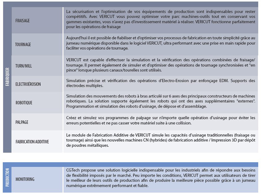 Le logiciel VERICUT® de CGTech est une des solutions les plus diffusées du marché en matière de simulation, de vérification, d’optimisation et d’analyse pour obtenir des machines-outils CN, plus sûres, plus productives et plus profitables. Il est un des rares logiciels capables de fournir des résultats fiables grâce à la prise en compte de l’ensemble des paramètres de coupe. Le logiciel est co-développé avec les utilisateurs grâce à nos ingénieurs répartis sur deux sites de développement à Toulouse et Lorient.