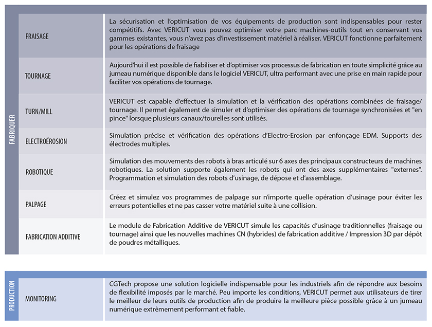 Le logiciel VERICUT® de CGTech est une des solutions les plus diffusées du marché en matière de simulation, de vérification, d’optimisation et d’analyse pour obtenir des machines-outils CN, plus sûres, plus productives et plus profitables. Il est un des rares logiciels capables de fournir des résultats fiables grâce à la prise en compte de l’ensemble des paramètres de coupe. Le logiciel est co-développé avec les utilisateurs grâce à nos ingénieurs répartis sur deux sites de développement à Toulouse et Lorient.