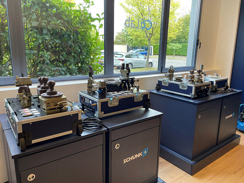 Au sein de son CoLab, SCHUNK propose de tester la faisabilité des applications dans un environnement réaliste. Les ingénieurs accompagnent les clients dans l’étude et la réalisation complète du processus. Cet espace dédié aux essais robotiques permet d’optimiser l’automatisation des productions.