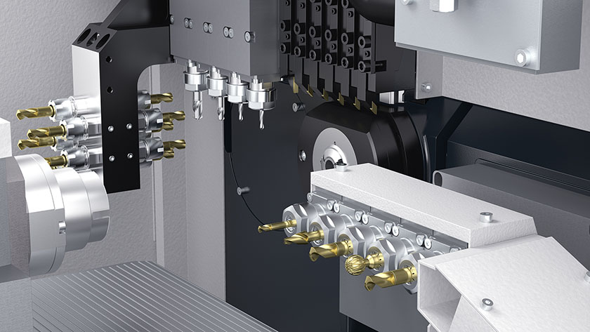 Capable de fonctionner avec ou sans canon, la CT 20 peut donc travailler en pince. La conversion se fait en 30 minutes. Comme avec les machines Swiss DT et Swiss GT, le passage en mode de travail sans canon se fait de manière extrêmement simple, grâce à l’interface homme-machine Tornos TMI qui facilite grandement la gestion de ce type d’opérations. La CT 20 bénéficie d’une option unique : deux outils frontaux peuvent être ajoutés à côté de la contre-broche, augmentant d’autant ses capacités d’usinage.
