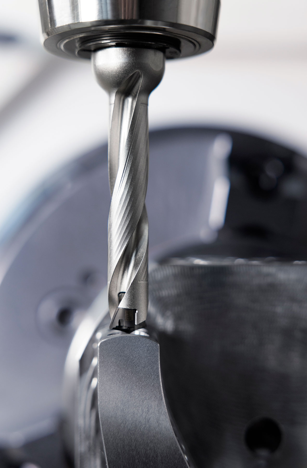 Le corps de perçage de la D5150 possède des points de contact radiaux renforcés ainsi que des surfaces de contact axiales biseautées qui absorbent idéalement les forces de coupe. La géométrie tridimensionnelle de la goujure avec un grand angle axial, combinée à une lubrification interne performante, permet une évacuation efficace et sûre des copeaux, y compris en cas de surfaces de perçage inclinées ou bombées. Outre sa productivité élevée, le foret à tête amovible se distingue par sa sécurité de processus résultant de la conception stable et brevetée de son embout de perçage avec sécurité anti-extraction axiale. Celui-ci assure un retrait sans risque et conserve son couple de desserrage même après de nombreux changements de tête.