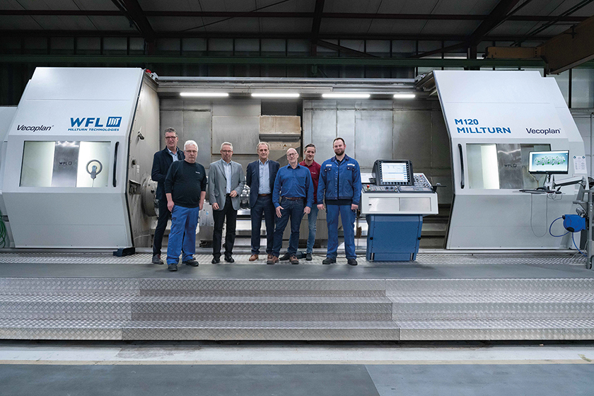 >> Autour du tour-fraiseur Multifonctions M120, de gauche à droite : Andreas Rose (Regional Sales Manager WFL), Klaus Weitershagen (Vecoplan), Thomas Kauls (Kauls GmbH), Reinhold Wieland (Regional Sales Manager WFL), Martin Selbach, Daniel Dittmann, Nico Hammer (opérateur de machine chez Vecoplan)