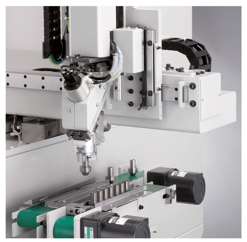 L’usinage en 5 axes simultanés est réalisé par le biais de la nouvelle commande numérique Mitsubishi Meldas 850. Il est possible d’utiliser jusqu’à trois outils en simultané dans la matière. Des courses courtes permettent d’importants gains de compétitivité sur des pièces de fraisage pouvant s’inscrire dans un diamètre de 38 mm.
