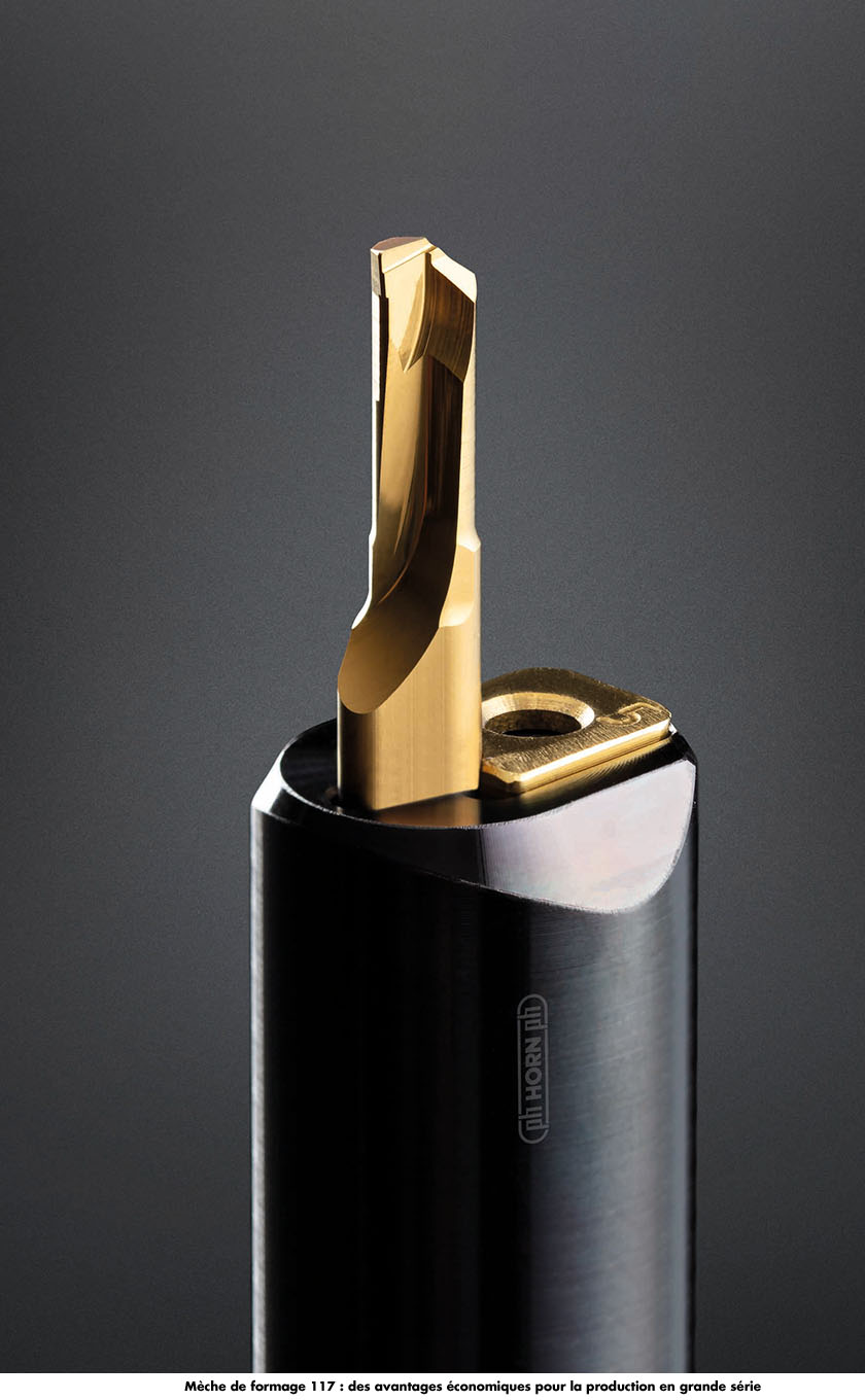 Le tournage à l’aide d’outils de formes offre des avantages économiques pour la production en série. Sur la base du système d’outil 117 et selon les besoins du client, Horn propose des systèmes de plaquettes de coupe de formes pour l’utilisation sur des centres de tournage / fraisage, à partir d’un diamètre de 16 mm. Le siège de plaquette breveté du système 117 permet de disposer d’une précision élevée sur la concentricité et le battement axial, ainsi que d’un changement de plaquette au micron. Les coupes affûtées avec précision permettent l’obtention de surfaces très précises et de qualité. L’économie réalisée en matière de coût est due à la possibilité de rééquipement, aux frais d’outils réduits et au temps d’immobilisation des machines moins important. Le refroidissement de la zone de contact et l’évacuation des copeaux sont assurés par une alimentation interne en fluide de refroidissement, via le support cylindrique, sur les deux coupes.