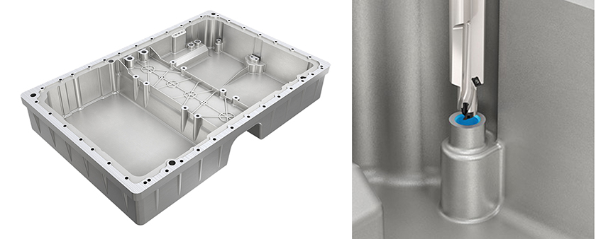 À l’inverse du moteur thermique, le moteur électrique génère un couple maximum dès sa mise en route, éliminant une transmission complexe. Un embrayage simple, situé entre le carter du stator et le carter d’embrayage, suffit pour un véhicule électrique medium. Pour maintenir la concentricité entre les assises de roulement du stator et le carter d’engrenage, l’opération d’alésage doit être efficace dans la même séquence. ISCAR a ainsi développé un outil d’alésage type « push & pull » avec lames PCD réglables pour stabiliser les tolérances géométriques exigées dans les différents diamètres intérieurs de la pièce en aluminium.