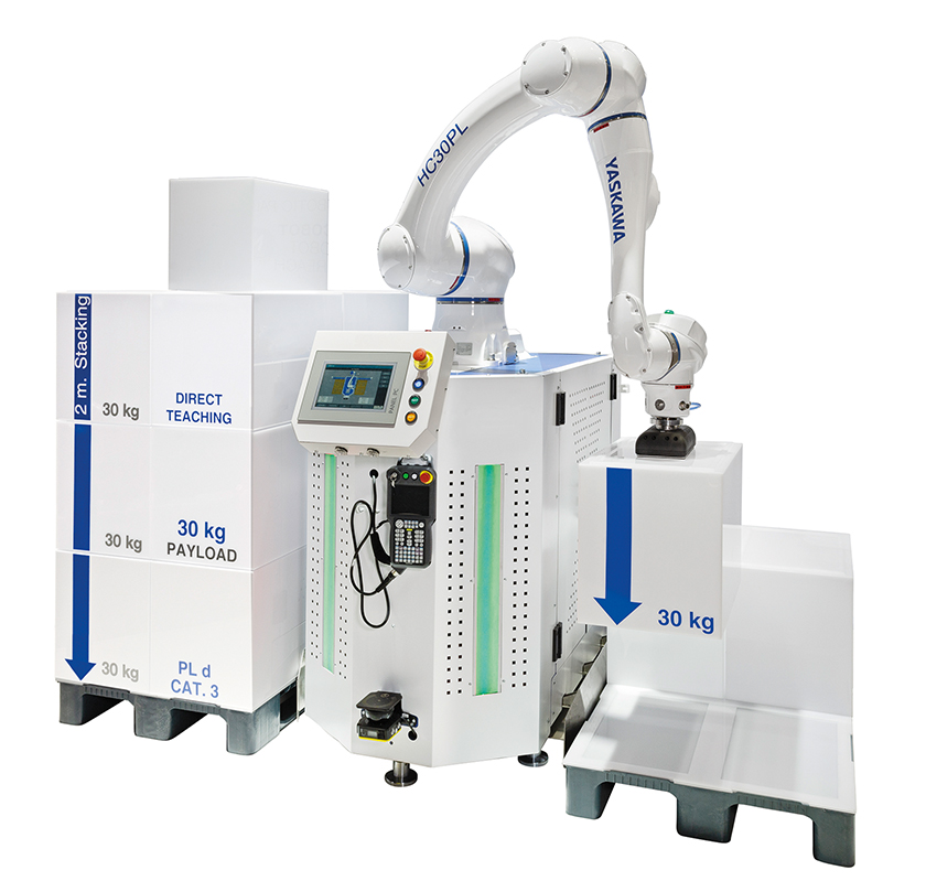 Son rayon d’action allant jusqu’à 1 700 mm, tout comme pour le robot collaboratif Motoman HC20DTP, il permet d’automatiser la palettisation ou la dépalettisation de grands cartons, de caisses ou autres marchandises empilables. Comme pour toute la gamme de cobots de Yaskawa, la sécurité requise en cas de contact direct avec l’opérateur est assurée par six capteurs de couple intégrés dans chaque axe, qui permettent une interaction flexible et contrôlée entre le robot et son environnement.