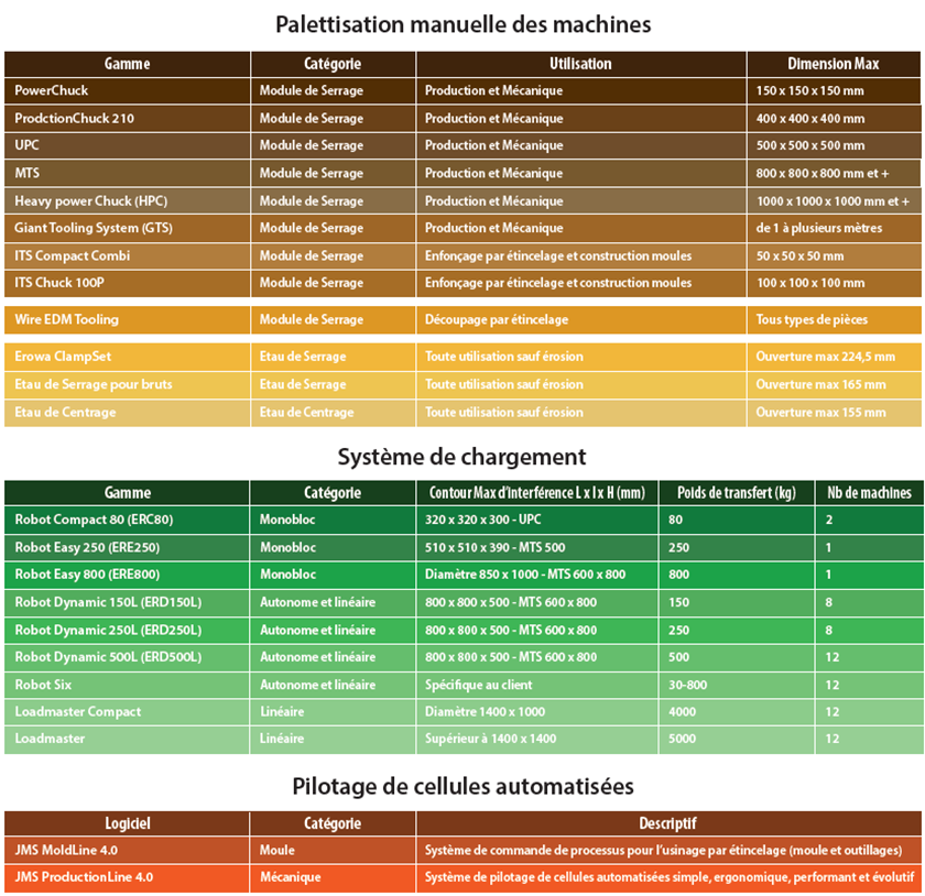 « EROWA est une société Suisse à taille humaine et présente à travers le monde sur tous les continents. Elle conçoit, fabrique et commercialise des solutions de palettisation manuelles et des robots de chargement pour les machines-outils. Depuis 1987 EROWA a installé plus de 7000 robots. EROWA intègre un savoir-faire entièrement maîtrisé avec des systèmes Point 0 de qualité, des solutions d’automation fiables et complètement évolutives, et un logiciel de pilotage JMS 4.0 qui fait référence. »