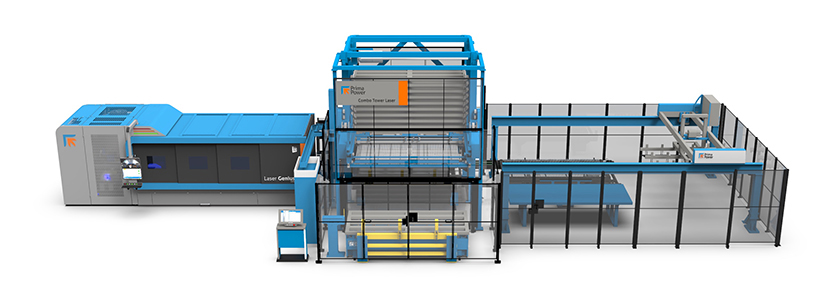 >> Prima Power Laser Genius+ avec le système de stockage Combo Tower Laser et le robot de triage et d’empilage PSR 2D