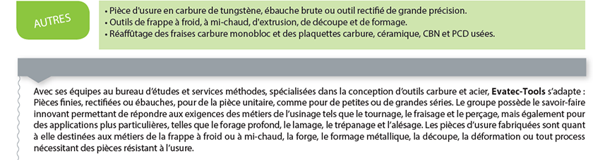 Concevoir et développer des outils de coupe, d’usure et des outillages qui répondent aux besoins de performance et de productivité est au cœur des préoccupations du groupe Evatec-Tools : une réduction des temps de cycle, une meilleure utilisation des machines, des nuances performantes et spécifiques aux applications, ainsi qu’une augmentation de la durée de vie des outils. Cette adaptation aux besoins des clients permet au groupe de servir les grands donneurs d’ordre des secteurs de l’aéronautique, de l’automobile, de l’énergie, de la sidérurgie et de l’agroalimentaire.