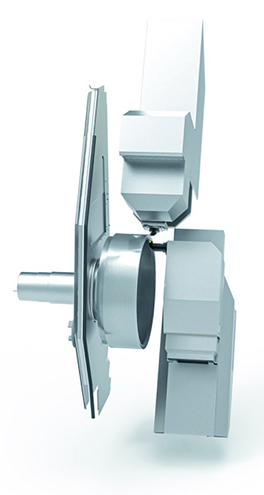 Autre exemple, l’usinage complet 4 axes de bagues (concept top/bottom). En utilisant deux porte-outils simples (top/ top), cette variante permet d’obtenir une compensation des forces de coupe. Pour les pièces à parois fines en particulier, il est possible d’obtenir une qualité de pièce nettement supérieure et un temps d’usinage plus court. Dans ce cas, le système « top » est constitué par une unité TB (tournage avec axes X, Z, Y et B) ou MT (usinage complet à 5 axes). Le système inférieur est configuré comme une unité T (tournage avec 2 axes). Les deux outils peuvent être automatiquement échangés et très rapidement.