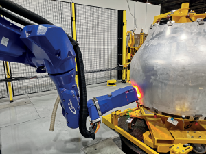 Une station optique de mesure est manipulée par un robot comme un outil. Le robot peut donc charger la station de mesure pour la déplacer afin de contrôler l’ensemble du liner en garantissant une distance de travail constante (focalisation). La détection de trous est réalisée sur chaque image acquise lors du déplacement du robot. Finalement, l’ensemble de la surface est contrôlé.