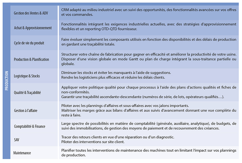 SYLOB est un ERP Cloud qui répond aux besoins des TPE, PME et ETI industrielles à la recherche d’une solution moderne et évolutive. La solution intègre de nombreuses fonctionnalités en standard et évolue fréquemment grâce à un investissement élevé en R&D. Nos clients industriels ont choisi SYLOB pour ses fonctionnalités de personnalisations impressionnantes et son ergonomie intuitive et agréable qui facilite son utilisation. Nous adressons de secteurs variés qui fonctionnent à la commande, à l’affaire et/ou sur stock, qu’il s’agisse de productions unitaires ou répétitives (petite, moyenne ou grande série).
