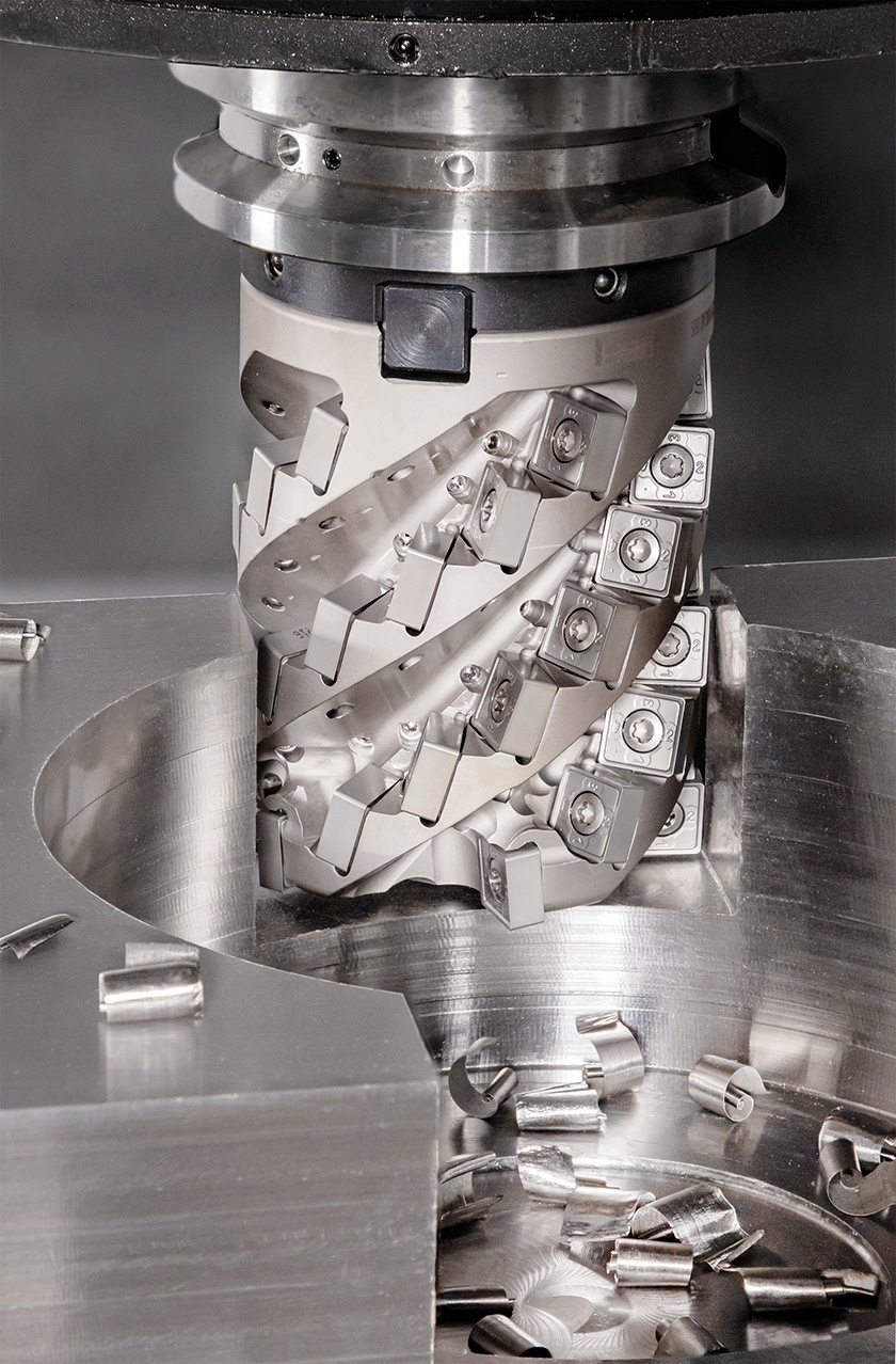 Un fraisage avec enlèvement efficace d’un grand volume de matière est crucial dans la production de pièces critiques soumises à contraintes, telles que les composants aéronautiques en alliage de titane, pour lesquels les fraises hérissons à plaquettes indexables sont très efficaces.