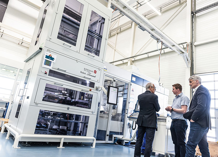 Avec des machines neuves ou reconfigurées, l’atelier dispose de robots Erowa évolutifs et reconfigurables. La gamme de robots fixes couvre la simple automatisation avec le magasin ERE et s’étend aux versions plus élaborées : ERC 80, RobotMulti et robot Leonardo. La gamme de robots sur rails, robots ERD et RobotSix, permet de démarrer dans une version mono ou multi-machines de façon compétitive, pour évoluer jusqu’à la desserte de douze équipements de production. Utilisant les technologies 4.0, elle offre une grande souplesse pour la personnalisation et l’optimisation d’un environnement multi-machines et multi magasins.