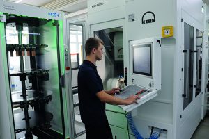 Afin d’obtenir les meilleurs résultats, les ingénieurs de Kern ont parfaitement adapté la Kern Micro HD aux besoins de W&K. Ils ont conçu et intégré une préparation spéciale de lubrifiant réfrigérant, une buse annulaire et un grand magasin d’outils avec 210 emplacements pour les supports HSK-E40. Cela signifie que le fonctionnement mixte marche toujours – simple et fiable. Tout aussi utile en termes de flexibilité élevée : la Kern Micro HD est entièrement automatisée avec une cellule System 3R. De plus, le CEO Mr Wild valorise les nombreux composants intelligents tels que les moteurs linéaires et hydrostatiques, et activement contrôlés par la température, qui atteignent des accélérations jusqu’à 2 G et des vitesses de déplacement rapide allant jusqu’à 60 m/min.