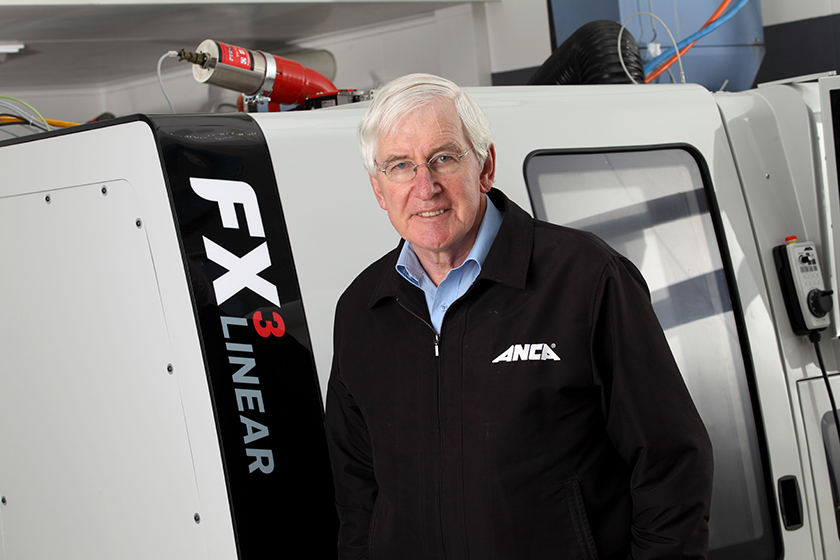 >> Pat Boland, cofondateur d’Anca, devant un modèle FX de machine Anca