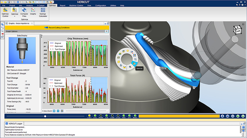 Une maîtrise parfaite de ses moyens de production permet de s’organiser et de prévoir la production au mieux. Il devient possible de répondre à la demande en temps et en heure en exploitant au mieux les ressources disponibles. C’est en tirant le maximum des machines-outils que le module Force de VERICUT entre en scène. Force est un module logiciel qui utilise une méthode d’optimisation basée sur la physique pour déterminer la vitesse d’avance maximale fiable pour toute condition de coupe donnée en fonction de quatre facteurs : les efforts sur l’outil, la puissance de la broche, l’épaisseur maximale du copeau et la vitesse d’avance maximale autorisée. Il calcule les vitesses d’avance idéales en analysant la géométrie et les paramètres de l’outil, les propriétés des matériaux de la matière et de l’outil de coupe, la géométrie détaillée de l’arête de l’outil de coupe et les conditions de contact coupe par coupe.