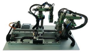 Dans cette application, l’automate de manutention est commandé par un moteur pas à pas et utilise un entraînement par courroie dentée en combinaison avec une vis à billes pour le convoyage de composants sur l’axe horizontal. norelem a développé cette application pour montrer le transfert le long d’un axe vertical , c’est pourquoi une table de positionnement circulaire a été choisie pour l’alimentation en pièces sur les deux axes.