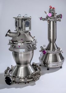 >> Chambres de poussée des moteurs Ariane. Ici les deux premiers modèles de vol du moteur de l’étage principal Vulcain 2.1 et du moteur de l’étage supérieur Vinci.