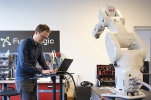 À la deuxième étape, un robot est mis en place à proximité des zones de soudure de la tuyauterie. L’exigence de précision de déplacement de la sonde d’inspection demande l’utilisation d’un robot pour obtenir une orientation et un positionnement précis. Grâce au logiciel mis au point par Fuzzy Logic, Fuzzy Studio, le robot peut être rapidement mis en place par les opérateurs, sans nécessiter d’importantes précisions de positionnement sur la tuyauterie. Les capteurs 3D intégrés sur le robot permettent de recaler rapidement et simplement le robot dans son environnement réel. Les trajectoires peuvent être déterminées en quelques secondes et quelques clics de souris. La combinaison entre la trajectoire complexe calculée par Fuzzy Studio et le scan 3D de la structure de la soudure par Visionic génère la trajectoire d’inspection adaptée à la surface réelle. La dernière étape consiste en l’inspection de la soudure par ultrasons.
