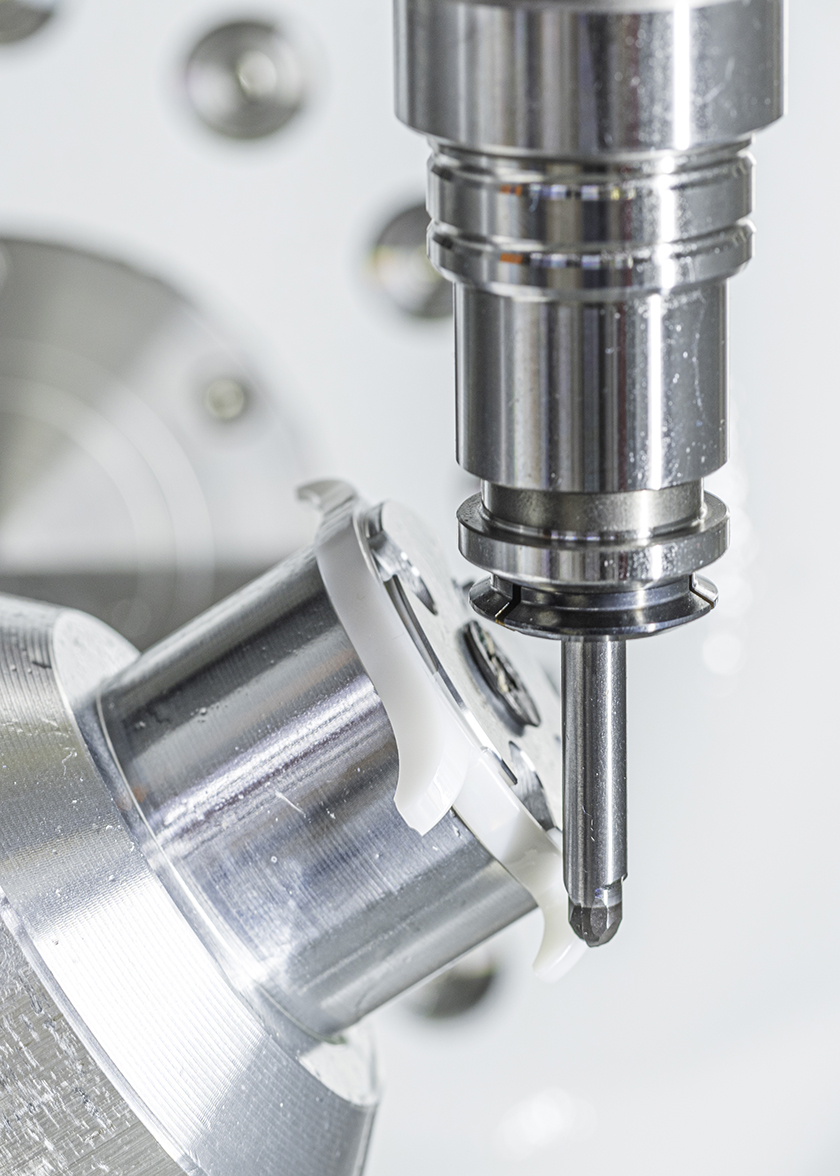 >> Ici, un boîtier de montre en oxyde de zirconium est fraisé sur un Kern Micro HD en cinq axes avec des outils PCD complets. (Photos : Kern Microtechnik).