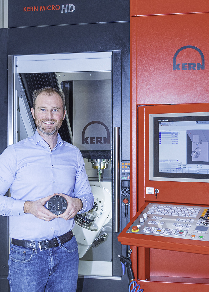 Ici, en huit étapes technologiques – de la poudre à la pièce finie – toutes les tâches de production sont réalisées à partir d’une seule source. Les deux dernières étapes de traitement sont effectuées sur le centre d’usinage Kern Micro HD. Les premiers débits d’enlèvement y sont effectués au moyen d’une rectification par coordonnées avec des pointes montées. Après cela – et c’est crucial – vient la finition avec le mode de coupe de fraisage ductile. Au cours de tests approfondis, l’équipe de technologie d’application de Kern a travaillé avec le client afin de déterminer l’épaisseur moyenne parfaite de la pièce nécessaire pour permettre à la pièce céramique de s’usiner correctement. « La fenêtre de processus étroite doit être maintenue de manière fiable, sinon la qualité des pièces en souffre et les outils coûteux sont soumis à un taux d’usure élevé », explique Alex Stauder.