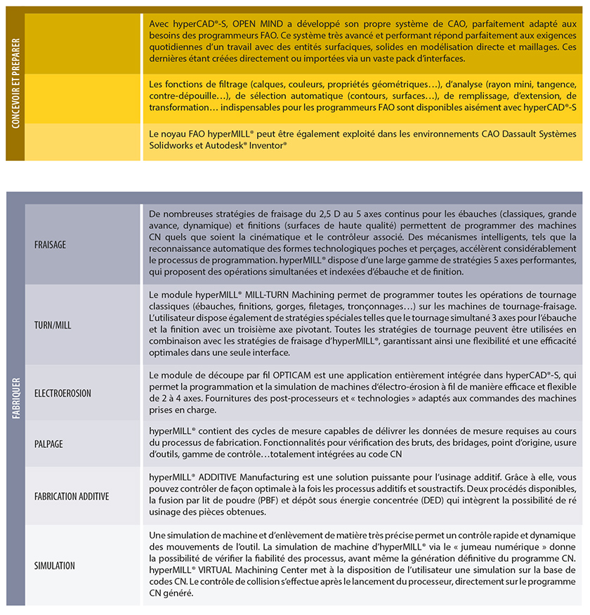 OPEN MIND développe une solution FAO comportant une part élevée d’innovation pour des performances optimisées dans le domaine de la programmation. Les stratégies telles que le fraisage 2,5D, 3 ou 5 axes, le fraisage-tournage et les usinages UGV et HPC sont efficacement intégrées dans le système FAO hyperMILL®, auquel s’ajoute un « jumeau numérique » sécurisant le code CN généré.