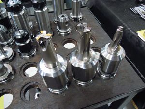 >> Trois des fraises Mitsubishi (fraise AJX et forets MVX) devant la machine ayant servi à réaliser une pièce plus complexe que d’habitude