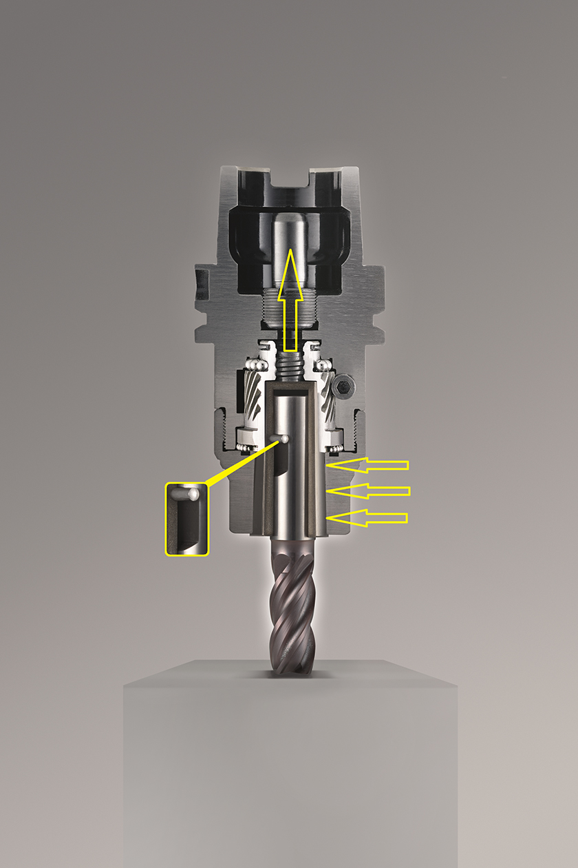 La suppression de l’écrou en bout permet de conserver l’équilibrage réalisé en usine. Le système de butée de réglage est incorporé à la pince et l’arrosage peut être central ou périphérique. Par ailleurs, un revêtement dur, antifriction, assure le bon glissement dans le cône afin d’augmenter le serrage et la longévité de la pince. Pas besoin de machine, il suffit de 10 Nm pour obtenir une force de 3 tonnes, le serrage peut s’effectuer manuellement ou à l’aide d’une visseuse. Enfin, lors des opérations d’ébauche ce système apporte davantage de sécurité car il est possible d’obtenir un blocage positif avec le système de goupille Pin-Lock évitant les risques d’arrachement de la fraise.
