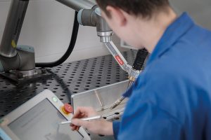 Dans ce cadre, la programmation du Cobot est possible sans des connaissances approfondies en informatique. « N’importe quelle personne capable de manipuler un smartphone, selon Torben Bruhn, peut également programmer le Cobot sans aucun problème ». Les données des pièces sont aisément entrées dans le logiciel Cobotronic par le biais du système d’assistance intégré et des paramètres tels que l’intensité de soudage et la vitesse d’avance du cobot sont calculés automatiquement. « La programmation du Cobot de soudage est plaisante et facile à comprendre », rapporte Simon Ludwig, soudeur chez Hodapp GmbH à Achern. Dans cette entreprise, le soudage était exclusivement réalisé manuellement jusqu’à maintenant. La technique de soudage automatisée fut une nouveauté totale pour le personnel, et les soudeurs n’ont pourtant rencontré aucune difficulté à l’utiliser. La manipulation intuitive du Cobot de soudage ouvre à l’entreprise la possibilité de décharger les soudeurs des tâches routinières, permettant ainsi également de faire face au manque de personnel spécialisé, et elle peut également susciter l’enthousiasme de jeunes collaborateurs pour intégrer le secteur du soudage.