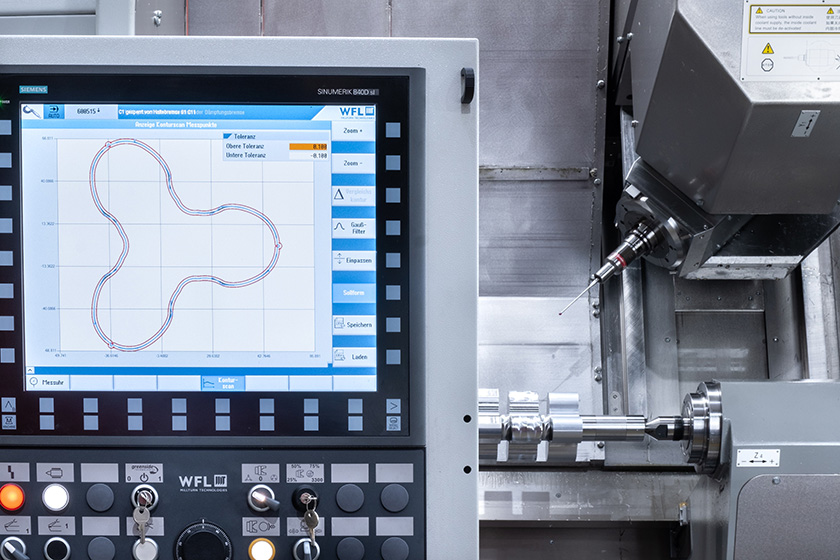 Afin de fabriquer des pièces complexes avec des exigences de qualité élevées, les processus doivent être contrôlés en « boucle fermée ». La production de petits lots – ou parfois seulement de pièces individuelles – implique des pièces brutes coûteuses, les petites pièces de réglage pouvant rapidement être « gaspillées ». C’est pourquoi WFL s’est concentré sur la mesure des pièces dans la machine dès le début de l’usinage complet et a développé des ensembles de cycles pour une variété de tâches de mesure.