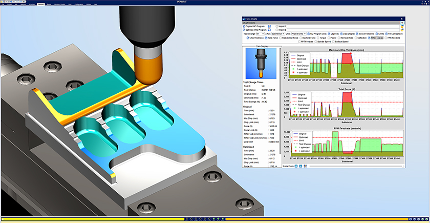 Force a également été appliqué à un programme précédemment optimisé. Cela a non seulement permis de gagner une heure sur un cycle de six heures, mais aussi de détecter et de supprimer un pic de chargement de l’outil qui aurait presque certainement entraîné la rupture de la fraise.