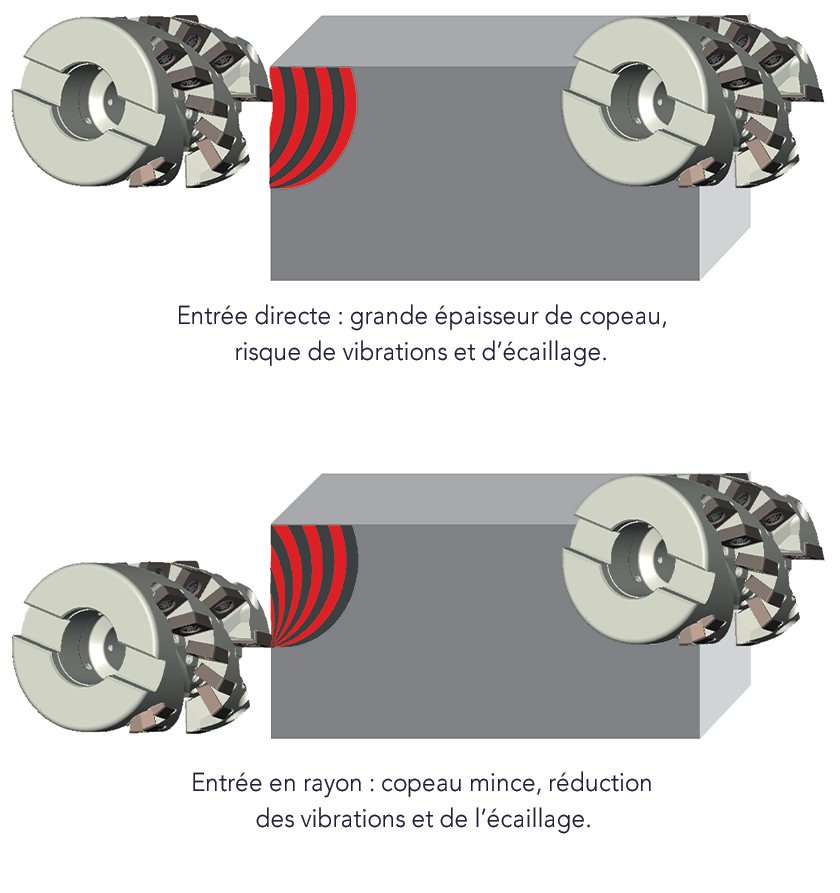 Afin d’exploiter pleinement les performances de l’ASPX, MMC Metal France préconise une entrée en coupe en rayon. Cette stratégie permet d’éviter les importantes variations d’effort de coupe, celles-ci étant susceptibles de provoquer l’écaillage des plaquettes. Ainsi, en associant l’entrée en rayon à un usinage en avalant, il est désormais possible d’éliminer la quasi-totalité des vibrations qui se créent lors d’une entrée droite conventionnelle. La réduction de l’épaisseur du copeau ainsi obtenue diminue encore davantage le risque d’écaillage des plaquettes.