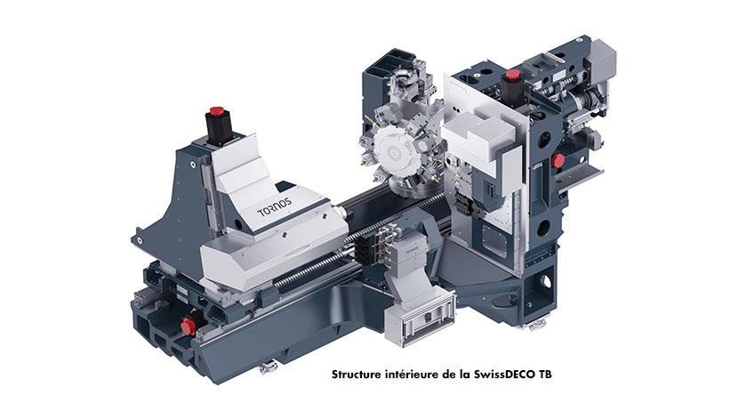 SwissDECO 36 TB repose sur la même structure que toute la gamme : une base en fonte ultrarigide, équipée d’éléments de guidage très largement dimensionnés, permettant d’exploiter le potentiel de la machine et des broches de très grande puissance. Le résultat de la combinaison de ces éléments est une machine capable de supporter des charges élevées en usinage, même sur les matériaux les plus coriaces. « Lors de la phase de conception de SwissDECO, nous avons voulu créer une machine sans compromis », relève Philippe Charles, responsable produit Swiss-type chez Tornos.