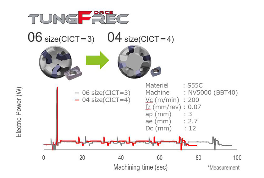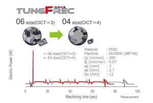 De même, le fait d’ajouter des arêtes de coupe réduit le temps d’usinage et génère ainsi des économies d’énergie (cf graphique TungForceRec). La puissance électrique est similaire mais le temps d’usinage est réduit grâce à l’augmentation du nombre de plaquettes. Cela a permis de réduire de 15% la consommation électrique.