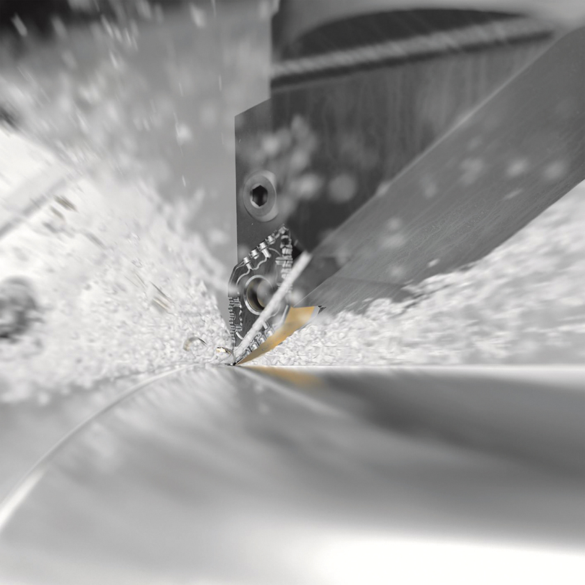 Le tournage des aciers s’avère une opération très exigeante pour les outils de coupe. Les outils de tournage équipés de buses d’arrosage de précision qui orientent le jet de liquide de coupe avec exactitude sur la face de coupe permettent de mieux contrôler la fragmentation des copeaux et de rendre l’usinage plus sûr. Outre l’effet sur la fragmentation des copeaux, l’arrosage de précision permet aussi de mieux contrôler la température pendant la coupe, ce qui prolonge la durée de vie des outils et la rend plus prévisible. De plus, la qualité de l’état de surface des pièces usinées est meilleure.