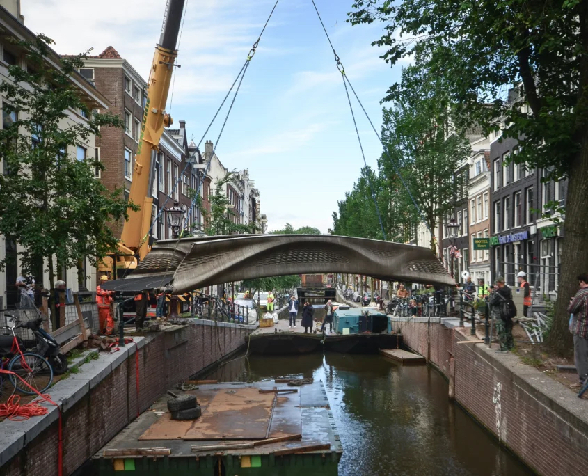 Démarré en 2015, ce projet avait pour objectif d’imprimer un pont métallique avec une technologie innovante d’impression 3D robotisée à grande échelle et créer ainsi un exemple ludique et inspirant sur l’utilisation des outils numériques dans l’architecture. Rassemblant des grands noms de l’industrie tels qu’ABB, Air Liquide, ArcelorMittal, Autodesk, Amsterdam Institute for Advanced Metropolitan Solutions (AMS Institute) et Lenovo, ce projet a mis en scène entre 2017-2018 quatre robots ; ceux-ci ont imprimé en 3D la structure en utilisant plus de 6 000 kg d’acier inoxydable.