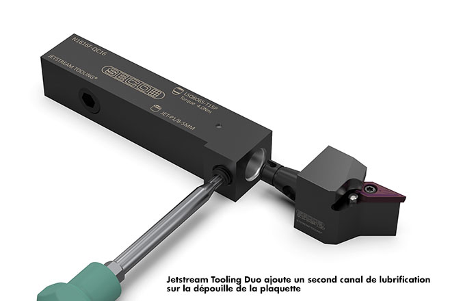 La technologie Seco Jetstream Tooling dirige précisément le fluide de refroidissement via le porte-outil modulaire QC sur la zone de coupe. Seco Jetstream Tooling Duo s’adapte à une sélection de têtes, ajoutant un second canal de lubrification sur la dépouille de la plaquette. Il peut être déconnecté si besoin pour un usinage plus polyvalent.