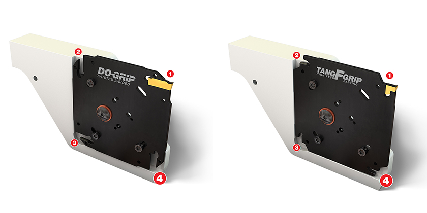 Toutes les plaquettes TANG-GRIP peuvent être montées sur les TANG-F-GRIP, tout comme les plaquettes de tronçonnage hélicoïdales réversibles DO-GRIP DGN, offrant un large choix de largeurs d’usinage pour tous les types d’application, auquel s’ajoute une grande variété de brise-copeaux et de nuances de pointe pour des performances inégalées.