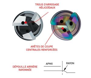Ces deux nouveaux types d’Alimaster présentent une hélice variable et des goujures polies. La géométrie des goujures évite le broutage. Les goujures hautement polies facilitent l’évacuation des copeaux durant les applications hautes performances. En outre, la coupe au centre a été optimisée pour offrir une résistance et une fiabilité accrues, même lors de plongée.
