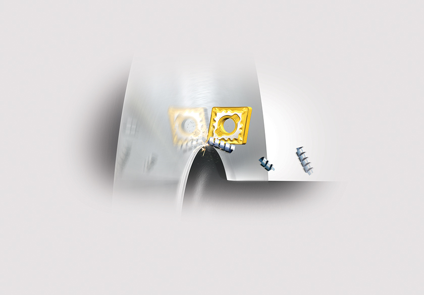 La forme des trous d’arrosage assure une alimentation stable en liquide de refroidissement, même après un ré-affûtage. L’évacuation des copeaux est, de fait, considérablement améliorée en plongée, en ramping et en rainurage pour assurer stabilité et efficacité.