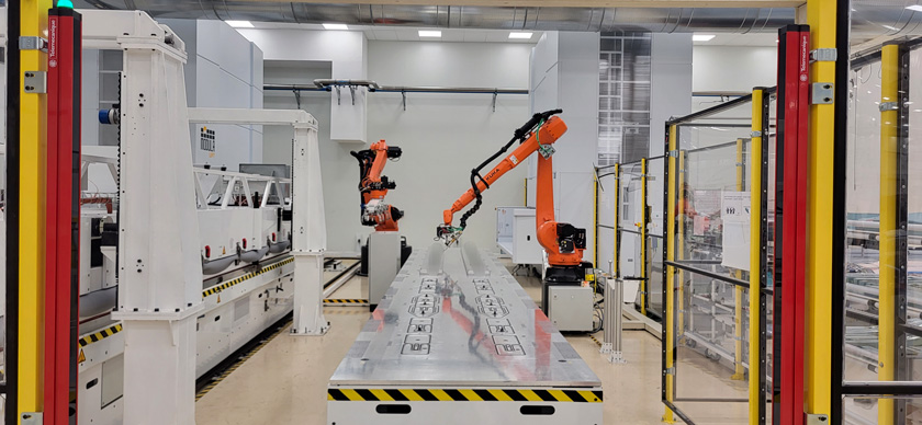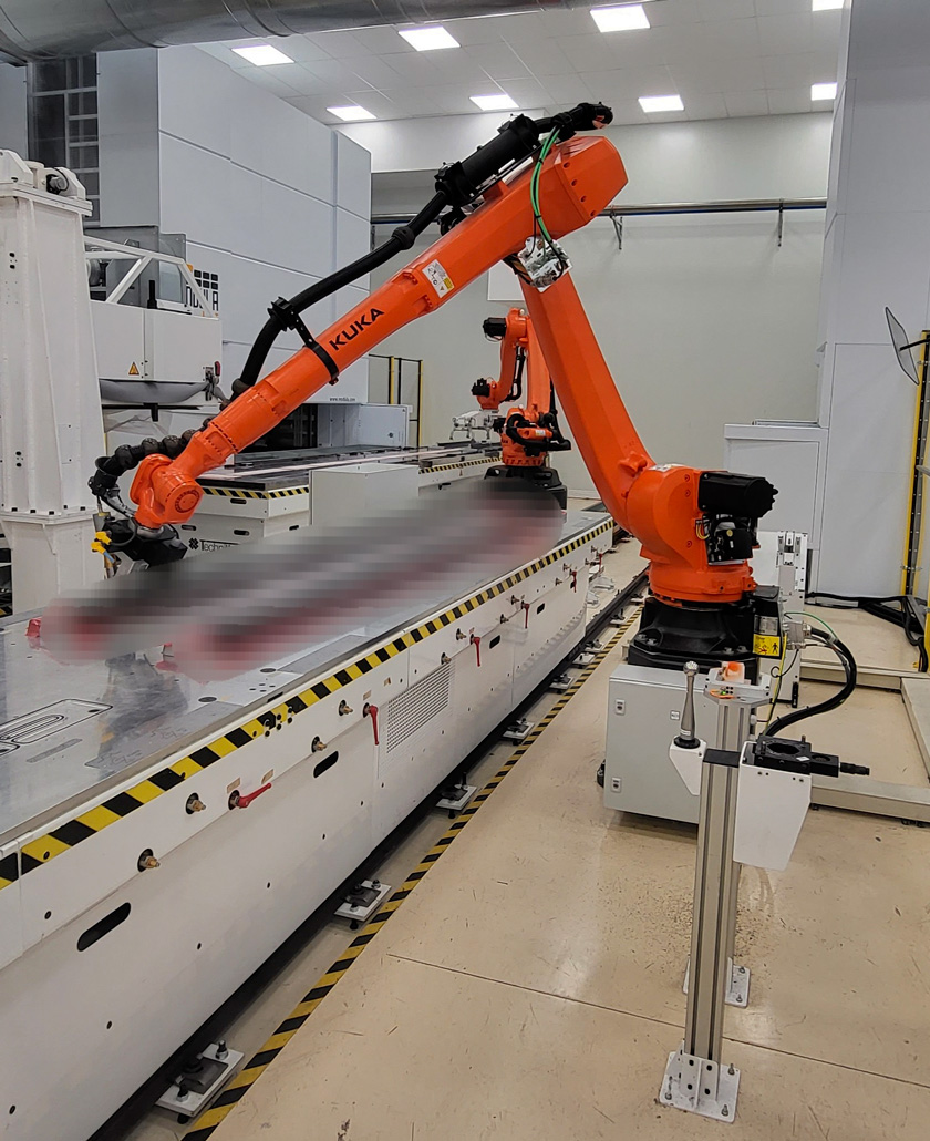 En matière d’automatisation cette fois, une douzaine de robots peuplent les différents ateliers. L’un d’entre eux – de marque Kuka – est chargé d’assurer la découpe de tissu cru. Cette opération de découpe doit donc s’effectuer à l’aide d’un couteau mécanique et dans des précisions avoisinant les 3 dixièmes. Le robot doit découper la pièce de forme gauche par rapport à une géométrie initiale et complexe dans la mesure où celle-ci doit être parfaitement positionnée dans l’étape de fabrication suivante pour qu’à la suite du process n’apparaisse aucun défaut géométrique.