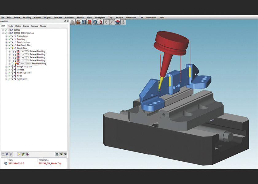 L’épaisseur de la nervure centrale mesure 1,27 mm (0,050″) ±0,025 mm (±0,001″), l’écart vertical entre les surfaces doit être de 0,025 mm et les deux surfaces opposées du support doivent par ailleurs être parallèles, avec une tolérance maximum de 0,025 mm. Pour usiner l’Invar et atteindre les tolérances requises, Ramco a utilisé différentes stratégies 5 axes innovantes d’hyperMILL.