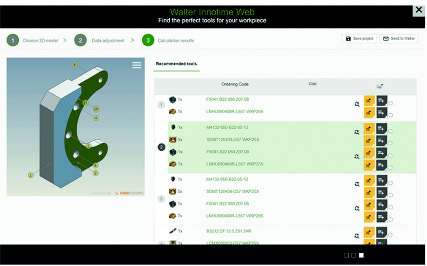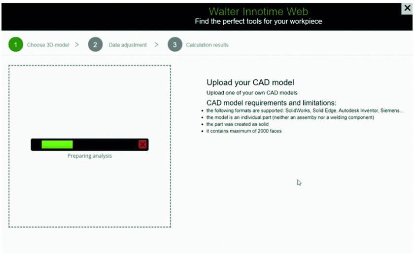 Avec Walter Innotime, les clients reçoivent une proposition de solution prête à être commandée de manière bien plus rapide. Et tout cela généralement dans les quelques heures suivant la réception de la demande. Tout ce que le client doit faire est de télécharger le modèle 3D de la pièce sur Walter Innotime. Le système interrogera ensuite d’autres paramètres en fonction de la complexité et des caractéristiques particulières.